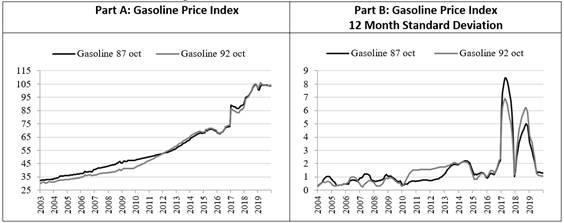 Figure A.2 on the left-hand side shows the gasoline price index for the 2003-2019 period. Then, the right-hand side graph shows the standard deviation of such index. In December 2017, the Mexican government liberalized gasoline prices, but in January 2017 started to increase prices considerably. This shock created an increase in the standard deviation, as can be seen on the right-hand side graph, and, consequently, the inflation rate rose to almost 7.0% in the following months.