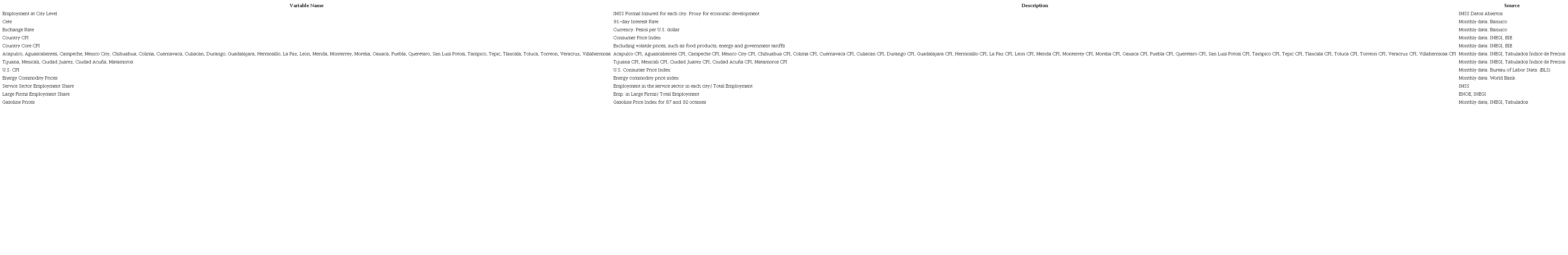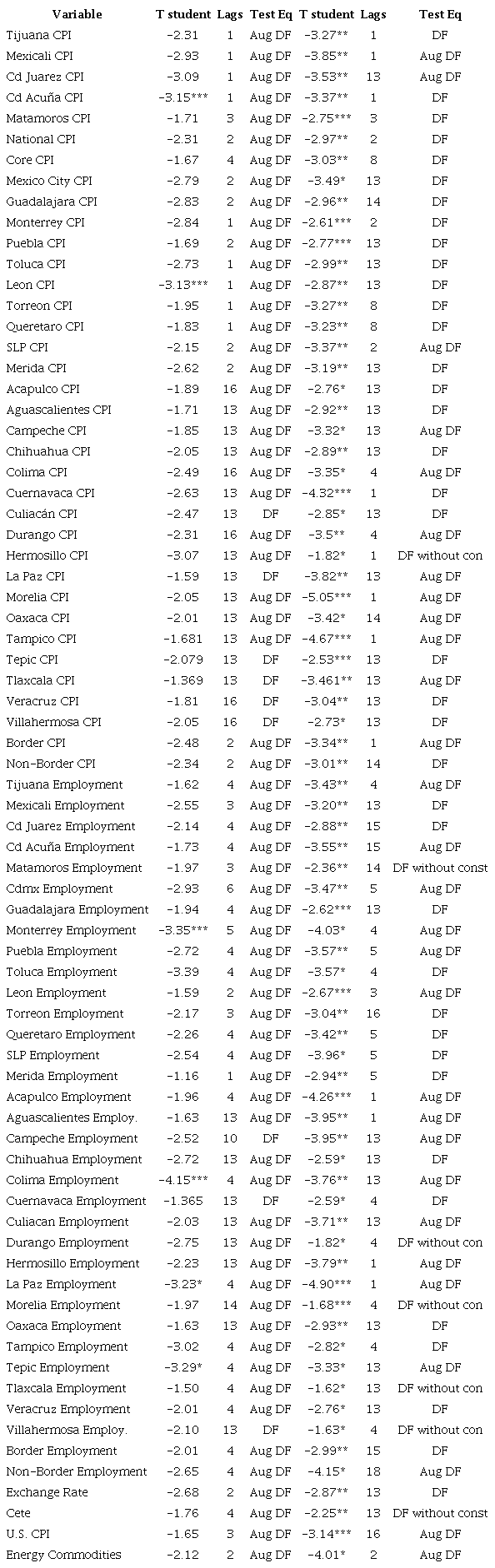 Some of the variables included in this study are taken from Romero and Catalán (2012) and Capistrán et al. (2012), while others are exclusive to this study since they capture relevant factors from the border and non-border cities. Table 1 displays a description and sources of all the variables included in this econometric model. The variables included in this study are the CPIs for each of the border and non-border cities, the formal employment for each metropolitan area, the interest rate (91-day Cete), the nominal exchange rate, and external control variables such as the U.S. Consumer Price Index, international energy commodities prices, and domestic control variables such as the proportion of people working in the service sector and the proportion of total employees in each city working in large firms (+ 250 employees).