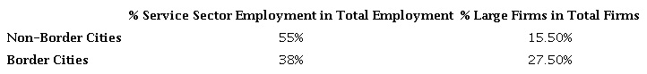 It can also be mentioned that border cities are smaller in comparison to other larger cities in the country and, consequently, the CPI in those small border cities is more sensitive to exchange rate shocks than elsewhere in the country. Other factors that could be relevant to justify the higher pass-through values found in border cities in comparison to non-border cities are the economic integration that has continuously increased in the last years between the Mexican north border cities and the U.S. south border cities because of NAFTA. A second factor could be related to the small size of the service sector in border cities in comparison to non-border cities. Literature about this was provided which argues that large service sectors in a city could make local economies more independent from external shocks (exchange rate variations). A third factor could be related to the percentage of people among total employees in a city working in large firms. Literature provided about this argues that, in general, large firms are more dependent on international trade (exchange rate variations) than small and medium firms.