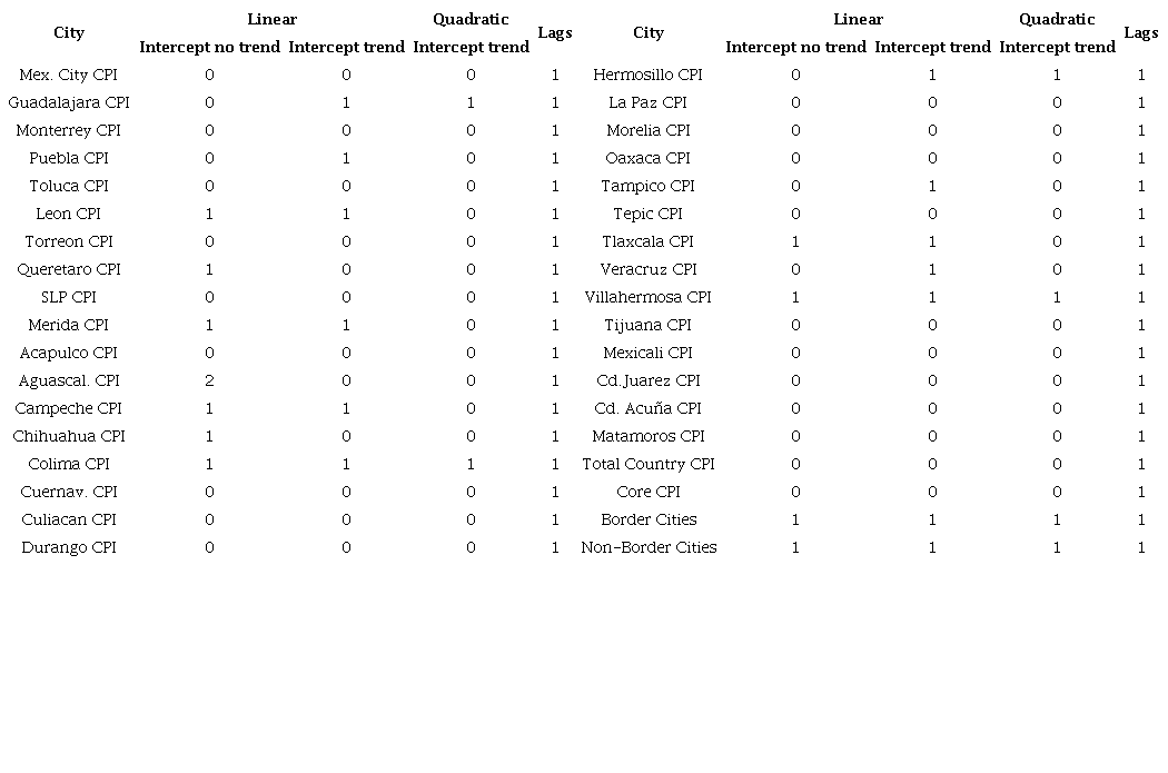 Table A.1 shows the results for the Johansen Cointegration Test under different conditions. The equation for this test includes employment, exchange rate, interest rate, CPI by city, and the exogenous variables U.S. CPI and energy commodity prices. Results show strong evidence of non-cointegration for most of the variables included in this study. The number of lags used in the model is one, obtained throughout the SIC test. In general, results do not show strong evidence of cointegration for all cities.