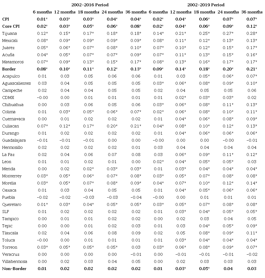 Results in table A.3 indicate that most of the transfer from changes in the exchange rate to the inflation rate occurs in the first two years, and the effect in the following periods is weaker. In all cases for border cities, the pass-through estimates are statistically significant. Results also indicate that pass-through values are higher when the gasoline price shock is included (2002-2019) in comparison with the period that excludes this price shock (2002-2016). Non-border areas, such as Chihuahua, Monterrey, Morelia, Colima, La Paz, Torreon, and Queretaro, show a positive relationship between the exchange rate and the inflation rate, though smaller than border cities. In the case of large cities such as Mexico, Guadalajara, and Puebla results do not show any relationship between both variables.