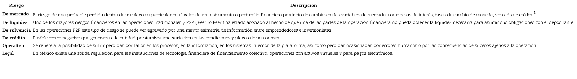 Dentro de las ventajas del fondeo colectivo en Pymes destacan la facilidad y relativa sencillez para lograr el fondeo, tasas de interés más competitivas, e inclusive permite la captación de los primeros clientes. Por otro lado, al financiador le permite participar en iniciativas de negocio innovadoras, con montos accesibles y a distintos niveles de riesgo. Dentro de las desventajas del financiado se tiene que muchas veces es difícil fondear la totalidad del proyecto en los tiempos establecidos si el monto a financiar es elevado, además del riesgo que implica hacer pública la idea de negocio, por otro lado, el financiador tiene la posibilidad de lograr resultados poco satisfactorios e incumplimiento, y en casos extremos incluso fraude por parte de los financiados. Entre otros aspectos existen riesgos que son inherentes al fondeo colectivo, los cuales se describen en la tabla 1.