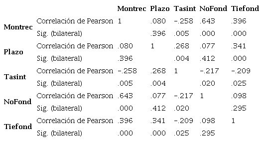 En la tabla 5 se describe la relación de las variables Tiefond con Ries y Montrec, Plazo, Tasint y NoFond , es decir se presenta el supuesto de homogeneidad de la regresión de la pendiente (prueba de efectos inter sujetos modelo personalizado).