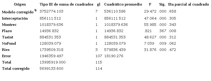 Se comprueba el supuesto de homogeneidad de la regresión de la pendiente, puesto que el ratio F de interacción entre las variables Ries * Montrec * Plazo * Tasint * NoFondF= 1.416 (P=.234) muestra que la interacción es estadísticamente no significativa en un nivel Alpha de .05. Este supuesto se evaluó con la suma de cuadrados tipo III por ser comúnmente aceptado, con la construcción de términos tipo interacción. Es evidente que el resultado de la interacción de covariables y variable independiente no es significativa, lo que sugiere el uso de la suma de cuadrados tipo II para esta prueba de diseño factorial personalizado (Langsrud, 2003), no siendo el caso cuando el diseño de prueba de efectos inter sujetos es del tipo factorial completo. Para esta prueba se usa la suma de cuadrados tipo III pues prueba los efectos principales en presencia de las interacciones. No hay diferencia de resultados ( Ries * Montrec * Plazo * Tasint * NoFondF= 1.416 (P=.234) al evaluar esta prueba con la suma de cuadrados tipo II y III lo que sugiere factores ortogonales.
