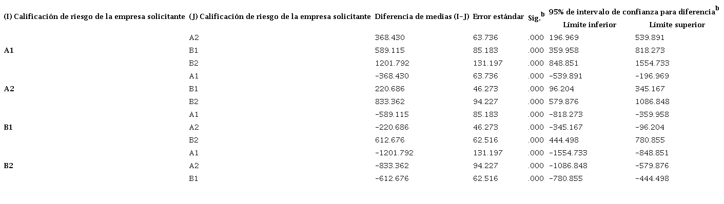 Se observa que existe diferencia significativa entre las clasificaciones de riesgo A1 y A2 (P=.000), A1 y B1 (P=.000), A1 y B2 (.000), A2 y B2 (.000) Y B1 y B2 (.000), indicando toma de decisiones por parte de los inversionistas en el momento de colocar su capital en un proyecto u otro.