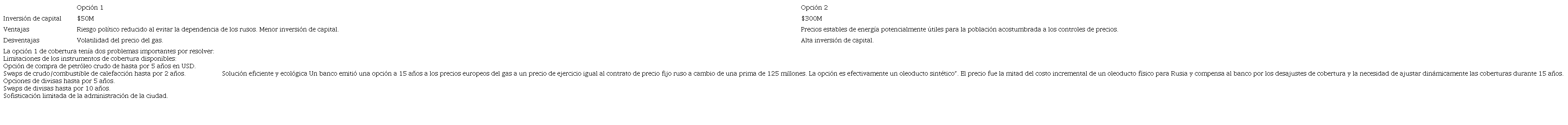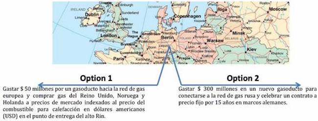 Consideremos el gasoducto de Leipzig en la década de los noventas en donde se utilizaron contratos derivados que jugaron el papel de un oleoducto sintético para crear una fuente de energía más eficiente en un mundo más limpio. La reunificación alemana en 1990 generó un rápido desarrollo económico y una mayor demanda de energía. Para satisfacer esta demanda se requirió una mayor oferta de gas natural. Leipzig tenía dos opciones que se muestran en la Figura 1 y el Cuadro 1.
