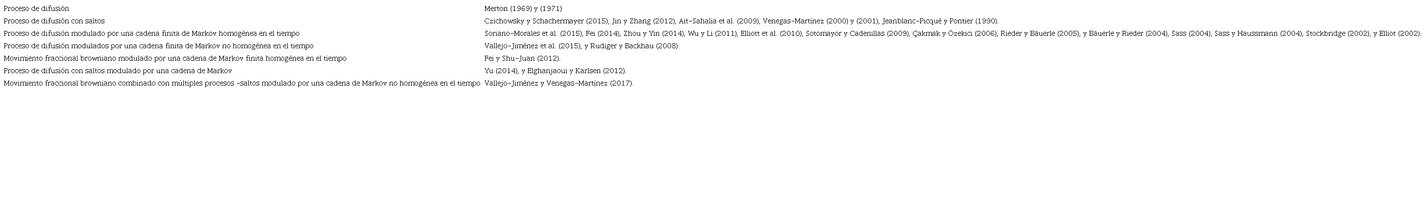 Otros trabajos, no menos importantes, que han estudiado el problema de la determinación de decisiones óptimas de consumo y portafolio con modelos de cambio de régimen markoviano son, por ejemplo: Stockbridge (2002) que proporciona una formulación de programación matemática del problema de optimización de portafolio; Zhang y Yin (2004) que ofrecen estrategias casi-óptimas en un mercado financiero; Sass y Haussmann (2004) quien resuelven numéricamente el problema de maximización de utilidad esperada del inversionista de la riqueza final en un horizonte de finito tiempo; y Vallejo-Jiménez et al. (2015) y Soriano-Morales et al. (2015) que combinan cambio de régimen markoviano con múltiples saltos.5