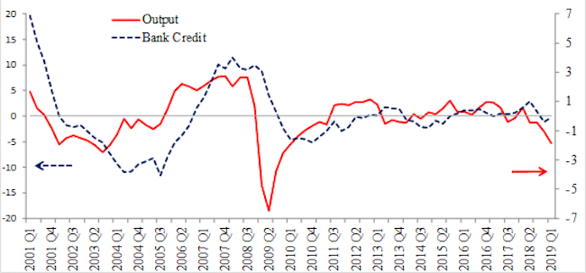Additionally, as in Iacoviello (2005), entrepreneurs are subject to a collateral constraint such that the maximum amount of real credit depends on a proportion of the expected value of their net worth in the next period. This design allows linking the real variables with the financial ones through an extra constraint in their maximization problem, which also represents a financial friction. Therefore, there is a limit on their banking obligations considering their net worth, which depends on economic performance. In this way, the model captures the procyclicality of the banking system and, at the same time, the limitations faced by entrepreneurs when they require loans. For instance, the correlation between the GDP and the total financing to the non-financial private sector from commercial banks in Mexico is 0.35 from 2001 to 2019, such correlation can be appreciated in Figure 1. In addition, similar to Lama (2011), the model captures that the Mexican economy is a net debtor, so entrepreneurs have the capacity to borrow from abroad paying a risk premium3.