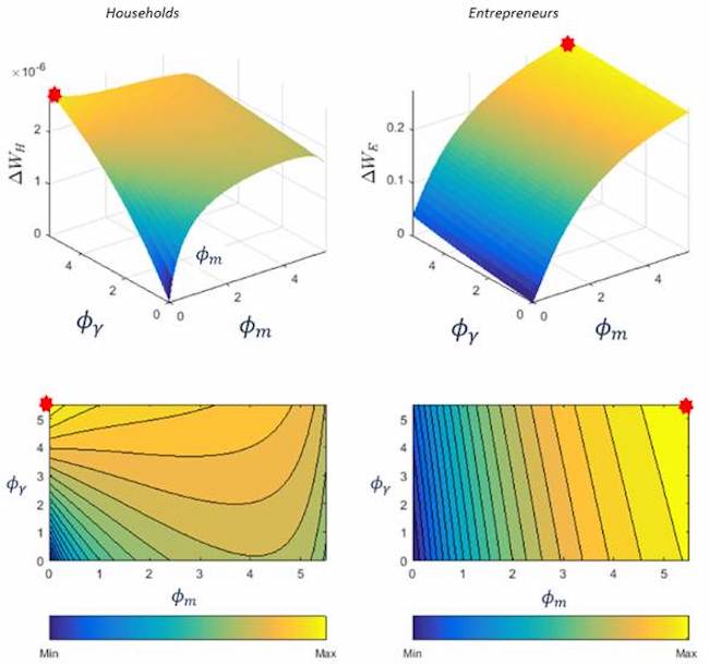The next step is to find numerically the adequate reaction that the macroprudential rules must have. Thus, it is necessary to test the possible values that the parameters and can take, verifying which one of them improves or damages the welfare of each agent in comparison to the benchmark economy. To find the best pair , a mesh is constructed where each direction represents a parameter that goes from 0 to a maximum value in such a way that it covers many values between those numbers. The maximum value is found until the Blanchard-Kahn conditions are no longer satisfied (i.e. when the model does not have a stable solution). This mesh has a sufficiently large number of pairs that are evaluated into the model using stochastic simulations of productivity shocks. After evaluating each pair, a welfare assessment is elaborated for households and entrepreneurs, separately. The welfare estimation is based on a second-order approximation to the households’ and entrepreneurs’ period utility functions around the deterministic steady state, following the process developed by Schmitt-Grohé and Uribe (2004)12.