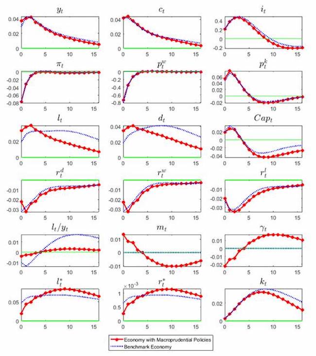 On the other hand, in the alternative situation where macroprudential policies are activated (the red circled line), CBCR and CLTVR are successful in keeping the credit-to-output ratio according to its long-term equilibrium. Initially, during the first periods, CBCR and CLTVR facilitate the credit conditions to take advantage of the productivity shock. However, periods later, these rules restrict credit conditions to avoid a high credit-to-output ratio once the productivity shock diminishes. In comparison to the benchmark economy, the credit-to-output ratio falls quickly and mitigates the adverse effects of a bust afterward where the economy is heavily indebted. The intuition behind these results is the following: CBCR are efficient in keeping a stable credit-to-output ratio because they give incentives to households to save depending on the business cycle, while CLTVR motivate entrepreneurs to borrow according to the productivity shocks.