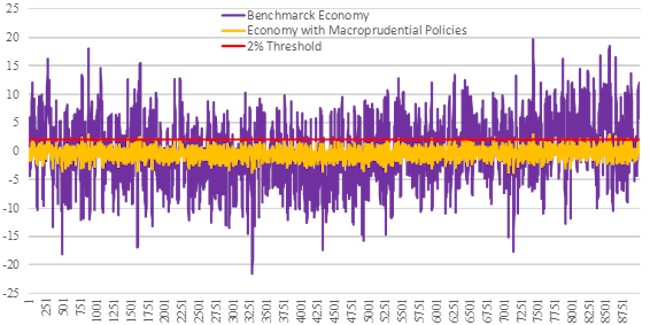 Regarding the creation of credit bubbles or high credit deviations, some additional clarifications must be considered. A credit bubble is a positive deviation in the relationship between credit and economic activity, and there are several methodologies that quantify it. For instance, Dell’Ariccia et al. (2012) provide a definition using the credit-to-output ratio that can be applied to a sample of 170 countries to identify the stylized facts that describe credit booms13. However, for the Mexican case and the BIS’ recommendation about the countercyclical capital buffers, a credit bubble is characterized when the credit-to-output ratio deviates positively from its trend by two percent. Therefore, an additional exercise is elaborated to show how the credit-to-output ratio dynamics change over time according to different banking regulations. Given a random path of productivity shocks, two simulated credit-to-output ratios are generated over time, one for the benchmark economy and another one for the alternative case. For the benchmark economy, there is a probability of 36.07% that the credit-to-output ratio excess the 2% threshold, which is consistent with the empirical behavior of the credit-output ratio deviations from its long-term trend (Banxico, 2017). In this case, the model produces credit bubbles because of the collateral constraint. This restriction specifies that the current value of the entrepreneurs’ debt grows according to the expected value of their collateralizable physical capital stock, which in turn depends on the contemporary investment. Therefore, when there is a positive productivity shock, there is an increase in the investment that produces a boost in the capital stock, which allows a persistent debt level and a positive credit-to-output ratio deviation for several periods. However, for the counterfactual case, CBCR and CLTVR do not tolerate significant credit-to-output ratio deviations, thus the creation of credit bubbles is very unlikely. In fact, its probability is equal to 0.6% in the model simulation. This exercise is displayed in Figure 7. Note that CBCR and CLTVR neither tolerate credit turndowns, showing their ability to deal with significant negative shocks, like the current COVID‑19 pandemic.