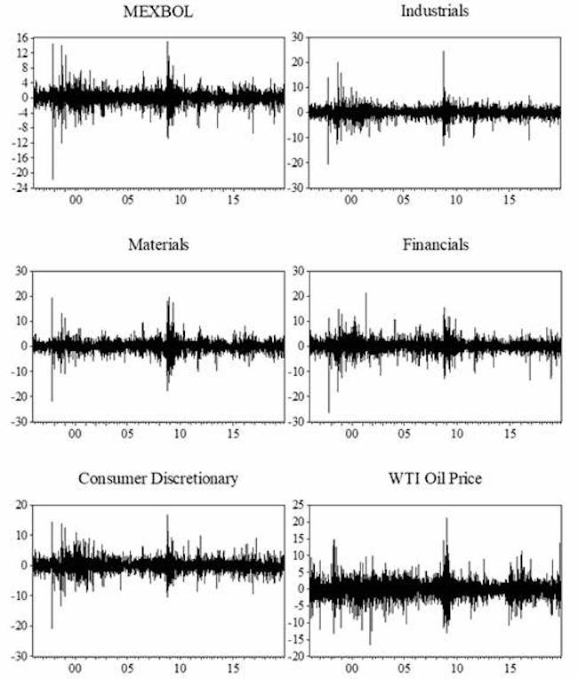 In line with several investigations that have addressed the relationship between oil price fluctuations and stock returns, this work utilizes bivariate Generalized Autoregressive Conditional Heteroskedasticity (GARCH) models to simultaneously estimate the behavior of conditional volatility of oil prices and returns of several selected sectors of the Mexican Stock Exchange. Stock return series very often present periods in which volatility may be concentrated, so GARCH models constitute a highly useful tool in financial time series analyses to tackle this issue (Brooks, 2014). A multivariate model was selected due to its advantage of being able to show how contemporaneous shocks on the analyzed variables may be correlated to each other (Enders, 2015). This possibility is one of the reasons why multivariate GARCH models are preferred to study the interaction between oil prices and stock markets rather than univariate models (Degiannakis et al. 2017). Furthermore, it has been documented that the multivariate modelling framework leads to more relevant empirical models than univariate models (see, for example, Bauwens et al. 2006).