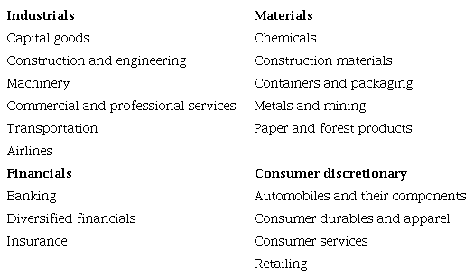 The variables used to measure the sectoral returns of different economic activities of the Mexican Stock Exchange (MEXBOL) were the aggregate sector indices calculated by MSCI for Mexico, which seek to capture the performance of large- and medium-capitalization listed firms within the same economic activity. Specifically, the interactions between oil price volatility and the industrial, materials, financial and consumer discretionary sectors, and the aggregate index of MEXBOL were analyzed. Figure 1 presents a general disaggregation of each selected sector’s activity according to the Global Industry Classification Standards (GICS). It is worth mentioning that index returns are in US dollars, which serves to mitigate the effects derived from exchange-rate fluctuations. Oil prices are measured as the WTI spot price, whereas the MSCI World Index was used as the exogenous variable. The source of the data was Bloomberg.