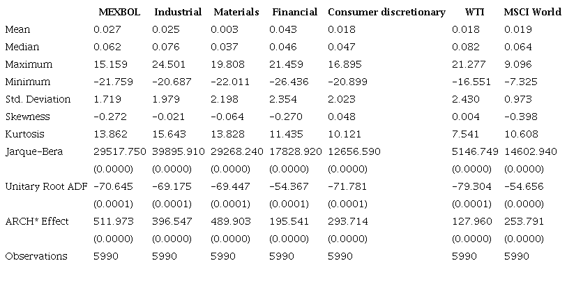 Table 2 shows the daily returns’ correlation matrix of the assets included in the analysis. It can be observed that oil price returns have a larger correlation coefficient with the materials sector (0.22), followed by MEXBOL aggregate index (0.19) and the industrial sector (0.18), whereas consumer discretionary reports the lowest degree of linear association with crude prices (0.14). All the correlation coefficients turned out to be positive.