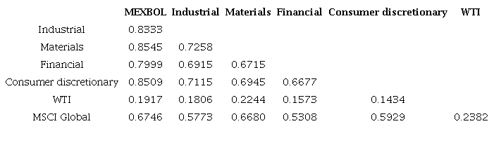 By studying the evolution of conditional correlations, it was found that, during most of the analyzed period, the relationship between oil and the selected sectoral stock returns of MEXBOL was positive and tended to intensify in financial stress episodes. In this regard, these results provide more support to the current that suggests that a price increase in oil due to demand-side shocks is accompanied by an increase in economic activity (and vice versa), which has a spillover effect on stock market performance. In this sense, the evidence reported in this work could be very useful in the processes of investment strategy planning and portfolio hedge formulation conducted by portfolio managers and other financial agents with exposures to oil and equity markets in Mexico. For instance, in periods of financial turmoil, investors with high exposure to materials related firms in Mexico could hedge their portfolio with short oil derivatives positions in order to mitigate risk. Likewise, constant monitoring of oil prices behavior could serve as an entry or exit signal of the different sectors analyzed in this work.