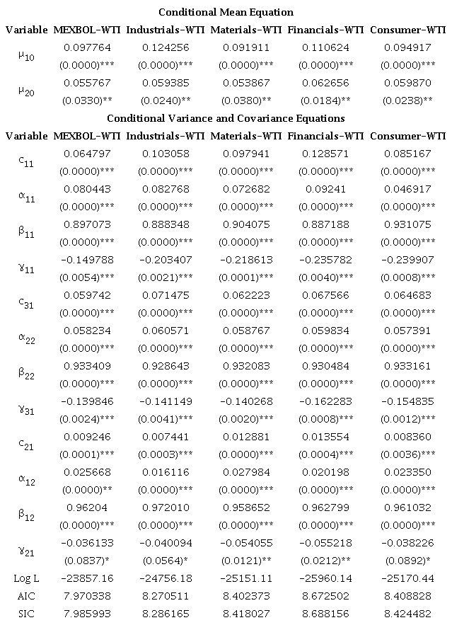 Thus, the diagonal VECH model utilizes only the diagonal elements of , and and sets all the values of , . Additionally, an aggregate index of the global equity markets was included as an exogenous variable as a proxy of world economic activity which has been found to have an impact on both stock prices in Mexico and oil prices (see, for example, López-Herrera et al., 2015; and, Breitenfellner et al., 2009). Thus, the conditional variance and covariance equations of the selected sector returns and oil prices with the exogenous variable with parameters that incorporates the global stock index returns in period are therefore given by: