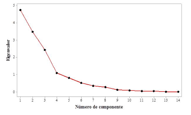 En la gráfica 1, se aprecia el alto valor del primer eigenvalor obtenido para el componente principal 1, el cual fue de 4.7219, representando el 33.78% de la variabilidad total. Sin embargo teniendo en cuenta los primeros 3 eigenvectores, estos llegan a explicar el 76% de la variabilidad total, mientras que los demás 11 eigenvalores presentan valores muy inferiores, representando en su conjunto el 24% restante de la variabilidad total. Este tipo de gráficas permiten apreciar de forma visual, la magnitud y diferencia que existen entre los diversos Eigenvalores que pertenecen a los distintos componentes principales, permitiendo corroborar si es pertinente utilizar alguno para la agrupación de las variables.