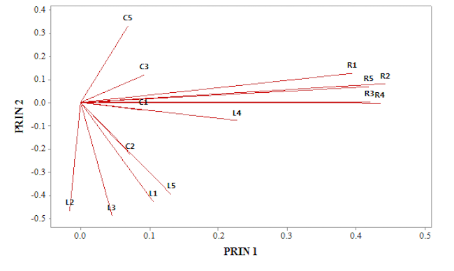 La gráfica 2 contiene los valores obtenidos para el componente principal 1 en el eje de las X, mientras que en el eje de las Y se muestran los valores obtenidos para el componente principal 2. Esta gráfica es un indicio de que los 3 rubros de las razones financieras analizadas, tienden a agruparse entre sí, es decir, puede observarse una agrupación de las variables L2, L3, L1 y L5 en la parte inferior de la gráfica, mientras que las razones C5, C3 y C1 tienden a agruparse en la parte superior de la gráfica. Finalmente en la parte media de la gráfica las razones R1, R2, R3, R4 y R5 tienden a agruparse. Se puede inferir en que los 3 rubros de liquidez, actividad y rendimiento están resumidos en la variabilidad que muestran los componentes principales obtenidos.