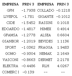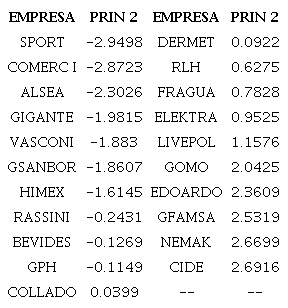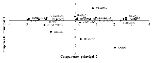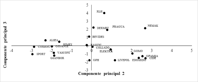 Respecto al componente principal 2, éste fue utilizado para clasificar a las empresas de menor a mayor liquidez, en donde la empresa con menor nivel fue Grupo Sports World, S.A.B. de C.V., empresa que se dedica a la comercialización a través de tiendas de una amplia gama de equipo y ropa deportiva, mientras que la empresa con mayor nivel fue GRUPE S.A.B. de C.V., dedicada a la compra-venta de productos de consumo, principalmente en líneas de muebles y ropa.