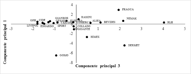 La gráfica 4 presenta los valores obtenidos para el componente principal 3 en el eje de las X, mientras que en el eje de las Y se presentan los valores obtenidos para el componente principal 1. Esta gráfica nos permite apreciar cuales empresas tienden a ser parecidas tomando en cuenta sus niveles de rendimiento y actividad. Pueden apreciarse ciertas agrupaciones entre empresas, tales como las que se observan en la parte superior izquierda de la gráfica, en donde las empresas EDOARDO, GFAMSA, SPORT, VASCONI y GSANBOR, presentan semejanzas entre sus bajos niveles de actividad y moderados niveles de rendimiento. En comparación entre la gráfica 3 anteriormente presentada y la gráfica 4, no se observan tantas agrupaciones, al contrario pueden detectarse varias empresas con características muy particulares, como se observa en la empresa DERMET, que presenta un bajo nivel de actividad, con moderado nivel de rendimiento. También la empresa FRAGUA presenta un desempeño muy distinto al de la mayoría de las compañías, impidiendo que se ubique en agrupación alguna, en su caso presenta un alto nivel de actividad, combinado con un moderado nivel de rendimiento.