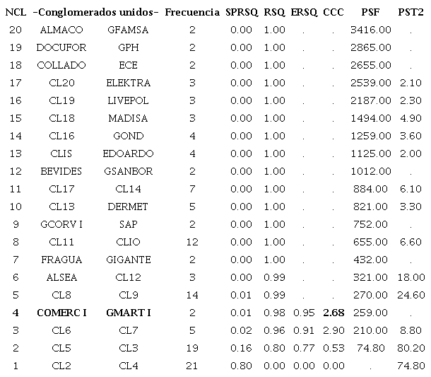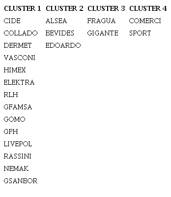 La tabla 15 muestra, la distribución de las 21 empresas del estudio en los 4 clusters formados, derivado de aplicar el procedimiento de K-medias, en donde se observa que la formación de grupos es muy similar a la que se obtuvo por medio del paquete estadístico SAS. La empresa EDOARDO se agrupa en el cluster que integra a la empresa FRAGUA y GIGANTE. En la primera generación de clusters del estudio, dichas empresas no compartían lugar con la empresa EDOARDO, sin embargo, esta diferencia de agrupación es mínima a pesar que los métodos de agrupación son distintos (jerárquico y no jerárquico).