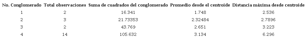 Los resultados de la tabla 15, indican la formación de 4 clusters, en los que el primer cluster se conforma por un total de 2 observaciones, el clusters 2 se forma por un total de 3 observaciones, el cluster 3 se forma por un total de 3 observaciones y finalmente el cluster 4 se compone de un total de 14 observaciones: