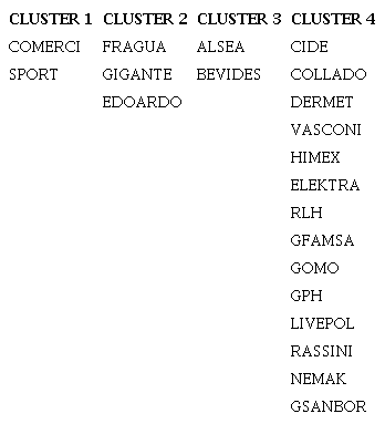 Para poder realizar una clasificación general de las empresas, se corrió un análisis cluster, que en base al CCC, se formaron 4 clusters en los que debido a las semejanzas presentadas en las 14 razones financieras de cada empresa, el cluster 1 quedó conformado por 14 empresas, el cluster 2 por 3 empresas mientras que el cluster 3 y 4 quedaron conformados por 2 empresas cada uno. Sin embargo para robustecer los resultados y realizar comparaciones entre la métodos de agrupación de variables, se aplicó un análisis de K-medias utilizando el paquete estadístico Minitab, en donde la única diferencia fue que la empresa EDOARDO se agrupa en el clúster que integra a la empresa FRAGUA y GIGANTE, resultante de aplicar el procedimiento PROCLUSTER del paquete estadístico SAS.