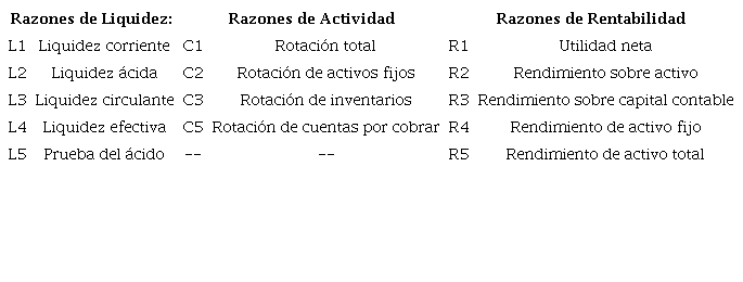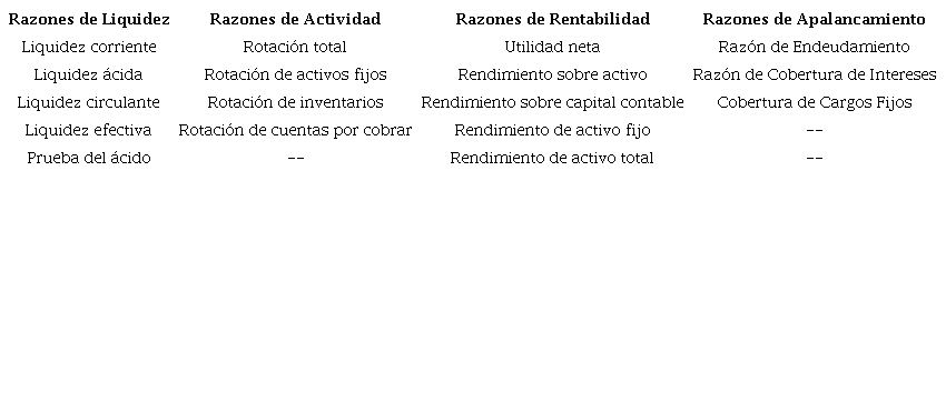 La Tabla 1 muestra las principales clasificaciones de las razones financieras, es necesario tener en cuenta que consultando a diferentes autores del campo de las finanzas, pueden encontrase distintas combinaciones entre estos indicadores, a fin de calcular diversos datos, aunque la mayoría de los autores coinciden en que estas razones son suficientes, ya que concentran la información más relevante de la empresa.