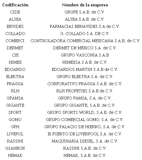 La tabla 3 muestra una breve descripción de cada una de las 21 empresas seleccionadas; la columna 1 muestra la codificación utilizada para el uso de la información en el paquete estadístico SAS, mientras que la columna 2 muestra el la razón social de le empresa.