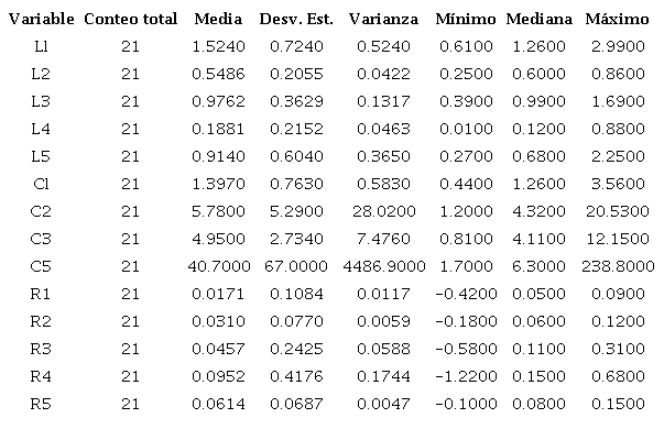 La tabla 4 muestra los estadísticos descriptivos para las 14 razones financieras analizadas en las 21 empresas seleccionadas, la columna 1 muestra la codificación de la razón analizada, la columna 2 muestra el conteo total, la columna 3 muestra la media de los valores obtenidos, la columna 4 muestra la desviación estándar, la columna 5 muestra la varianza, la columna 5 muestra el valor mínimo obtenido, en donde incluso pueden observarse algunos valores negativos, en la columna 6 se muestra el promedio de los valores calculados y finalmente la columna 7 muestra el valor máximo obtenido para cada una de las variables.