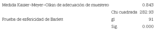 La medida de adecuación de muestreo de Kaiser-Meyer-Olkin es un estadístico que indica la proporción de varianza en las variables que podría ser causada por factores subyacentes. Los valores altos (cerca de 1.0) generalmente indican que un análisis de reducción de variables, puede ser útil con los datos. Si el valor es inferior a 0.50, los resultados de este tipo de análisis no serían confiables, por otro lado, la prueba de esfericidad de Bartlett prueba la hipótesis de que la matriz de correlación es una matriz de identidad, lo que indicaría que las variables no están relacionadas y por lo tanto, no son adecuadas para la detección de estructuras. Los valores pequeños (menos de 0.05) del nivel de significancia indican que un análisis de reducción de variables, es útil con los datos (SPSS statics, s.f.). Los resultados de la aplicación de estas pruebas se muestran en la tabla 5: