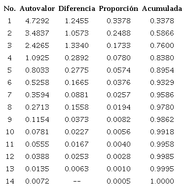 La tabla 6 muestra las cantidades de los eigenvalores obtenidos para cada uno de los 14 componentes principales obtenidos, después de correr el procedimiento PROC PRINT del paquete estadístico SAS. A mayor eigenvalor, indica que el componente principal al cual pertenece, es capaz de resumir una mayor proporción de la variabilidad total explicada por el conjunto de todas las variables que se analizan. La segunda columna de la tabla muestra un alto valor para el primer componente principal teniendo un eigenvalor 4.7219, el cual en base al valor mostrado en la columna 5, es capaz de resumir la variabilidad total del estudio en un 33.78%. Los Eigenvalores 2 y 3 también obtienen altos valores, siendo de 3.4873 y 2.4264 respectivamente, por lo que al observar el porcentaje acumulado de resumen variabilidad total, estos 3 Eigenvalores son capaces de resumir el 76% de la variabilidad total conformada por las 14 variables que se analizan en total.