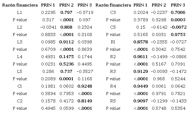 En la tabla 7 se muestran las correlaciones entre las 14 variables analizadas y los componentes principales 1, 2 y 3. Puede observarse que las 5 razones financieras del rubro de rendimiento presentan altos valores de correlación con el componente principal 1, respecto a las razones del rubro de liquidez 4 de las 5 razones presentan altos niveles de correlación con el componente principal 2, mientras que para las razones de actividad, 3 de las razones de este rubro presentan altos niveles de correlación con el componente principal 3. La significancia estadística de estos niveles de correlación se confirma al presentar valores de p < 0.05, con lo que se confirma que la técnica de ACP, es capaz de reducir el número de variables para analizar la información, ya que es posible utilizar los 3 componentes principales obtenidos para resumir la variabilidad que contienen las 14 variables originales del estudio.