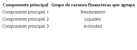 Teniendo la justificación de la utilización del ACP, por medio de la aplicación de la medida de KMO, junto con la prueba de esfericidad de Barlett y los altos valores de correlación entre las razones financieras y los 3 componentes principales obtenidos, se concluye que el componente principal 1 resume la variabilidad de las razones financieras del rubro de rendimiento, el componente principal 2 resume la variabilidad de las razones financieras del rubro de liquidez y componente principal 3 resume la variabilidad de las razones financieras del rubro de actividad. Esta información se muestra en la tabla 8: