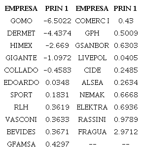 La gráfica 3 presenta los valores obtenidos para el componente principal 2 en el eje de las X, mientras que en el eje de las Y se presentan los valores obtenidos para el componente principal 1. Esta gráfica nos permite apreciar cuales empresas tienden a ser parecidas tomando en cuenta sus niveles de rendimiento y liquidez. Pueden apreciarse ciertas agrupaciones entre empresas, tales como las que se observan en la parte superior izquierda de la gráfica, en donde las empresas COMERCI, SPORT, ALSEA, GSANBOR y VASCONI, presentan semejanzas entre sus bajos niveles de liquidez y moderados niveles de rendimiento.