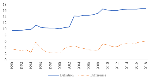 The following figure contains two ratios taking as a denominator the gross value added (GVA) at constant prices. The first is the consumption of fixed capital at constant prices based on the GFCF price index (Deflation), and the second is obtained as the difference of the “productive stock” and the “net capital stock” (Difference).