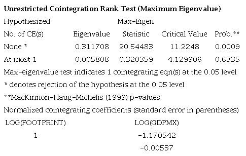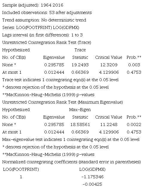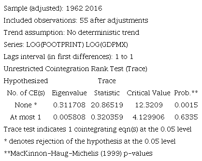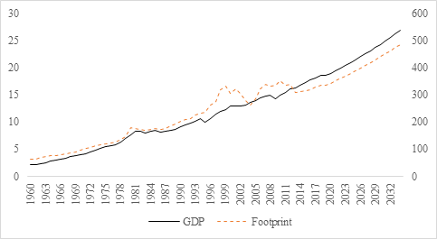 The following figure displays the GDP in volume and the ecological footprint for Mexico, actual data of GDP between 1960 and 2019, and of the ecological footprint between 1960 and 2016. To forecast their levels until 2034 −a selected year to be explained later−, we use the average annual GDP change between 2008 and 2018, namely 2.14 percent, a figure quite similar to the potential growth estimated by SHCP (2018). We estimate a VAR model between the pair of variables between 1960 and 2016 under a double logarithmic functional form. In the annex, we show its statistical test results. According to the Johansen test, in its rank and trace versions, there is a cointegration vector whose only parameter amounted to 1.17 percent.2 The following graph contains the levels of both variables.