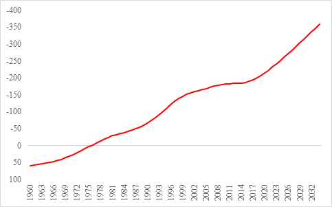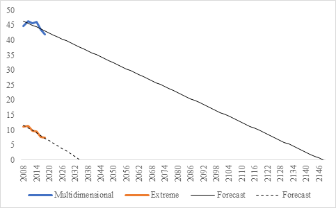 Although Mexico is part of the group of countries with middle incomes, poverty statistics are still terribly disappointing. Due to methodological issues and the availability of information, we only have data on multidimensional poverty and extreme poverty from 2008 to 2018 with a biannual frequency. Between those years, the percentage of the population in poverty decreased from 44.83 to 41.83, and in extreme poverty from 11.17 to 7.43. A deterministic trend yielded an acceptable adjustment to simulate both variables. The figure shows that we would reduce poverty to zero until 2034 and 2148 −assuming a scenario similar to that observed between 2008 and 2018.