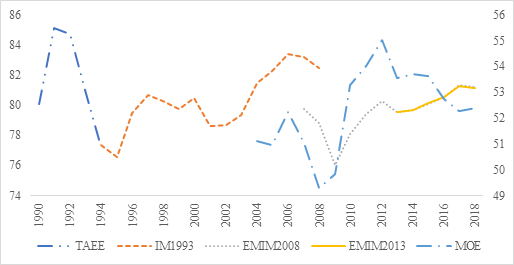 The empirical capital-labor ratio can be calculated using the information contained in KLEMS (INEGI, 2013). But doing so would imply assuming full employment. We may use surveys at hand to improve it (the Quarterly on Business Economic Activity TAEE, the Monthly Industrial Activity IM, the Monthly on Manufacturing Industry EMIM, and the Monthly Business Opinion Survey MOE). The following figure contains the capacity utilization of the fixed capital according to the mentioned different statistical exercises.