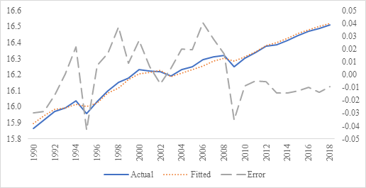 In the statistical annex we show the results of some tests carried out to verify the statistical adequacy of the regression, the non-stationarity of the included variables, and as a mechanism to avoid the spurious regression critique, the stationarity of the residuals (Engle and Granger, 1987; Hendry, 2000; Spanos, 2003). In general, the test results were acceptable. The constant represents the Solow residual −the so-called total factor productivity (TFP)− and, if we calculate its exponent, we obtain a positive number in millions of pesos at 2013 prices. Its statistical significance measured by the t value was rejected, a fact that does not surprise us given the performance of the Mexican economy during the analyzed period. The other two estimated coefficients make sense in terms of their value and sign; they were statistically significant and should be interpreted as elasticities. The hours worked in the primary and tertiary sectors were not significant. The determination coefficient was 0.98, which is not a surprise either since behind the proposed specification, we have an identity equation.1 The following figure contains the actual values, the fitted values, and the errors of the estimated regression.