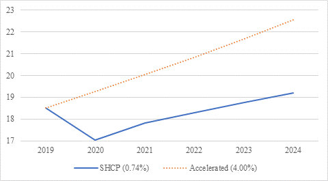 Our second simulation has two parts. The first is linked to the scenario proposed by the Criterios Generales de Política Económica 2021. The document recently published by SHCP established as goals of economic growth for 2020, 2021, 2022, 2023, and 2024 the following values, respectively: -8.0, 4.6, 2.6, 2.5, and 2.5 percent, implying an average annual growth rate of 0.74 percent between 2019 and 2024. Based on our econometric results, we determine the requirements in terms of the change of the capital stock in use. The second part of the simulation is linked to a four percent growth of the economy in the same period. The results were the following.