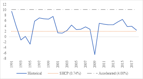 To evolve according to the goals proposed by SHCP, the stock of capital in use should change an annual average of two percent in the period 2019-2024. For the Mexican economy to achieve accelerated growth, the stock of capital in use should change, on average, ten percent. And the question is immediate: how possible is it to accumulate the necessary capital requirements, and their effective use, for the economy to grow at 0.74 percent and 4.00 percent? The answer, from a historical perspective, appears in the following figure.