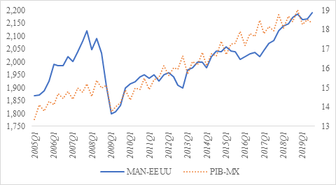 The following figure contains the levels of manufacturing GDP of the United States and GDP in Mexico in volume. It seems that both variables share a common time-path.