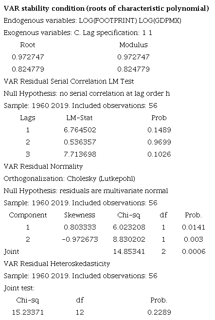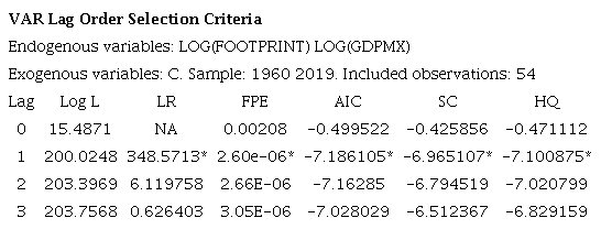 Tests related to the second VAR model (logs, FOOTPRINT and GDPMX):
