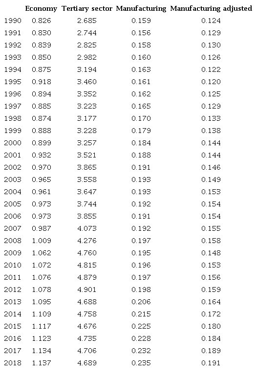 From the previous table, we emphasize, first, that the intensity of capital is different in the economy as a whole and the manufacturing, both due to the role played by the tertiary sector and the productive heterogeneity of manufacturing economic units; and second, that the four technical coefficients display an upward trend.