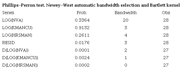 The one-equation model contained in (2) shows the results of the estimation of the aggregated production function by ordinary least squares for the period 1990-2018. By the way, all the empirical work carried out throughout the document used the complete set of available information generated by INEGI in terms of its extension and frequency. We included a dummy variable with zeros between 1990 and 2002, and ones between 2003 and 2018, to capture the accounting effect of the base year change.