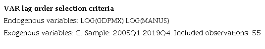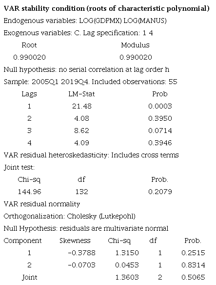 We estimate a VAR model with four lags under a double logarithmic functional form between 2015Q1 and 2019Q3. In the statistical annex, we show the results of some tests carried out to gain confidence in its use as a measuring instrument (Boumans, 2007, p. 3). In short, the test results were acceptable. The Johansen test in its two versions showed the existence of a cointegration vector reporting a value of 2.17325, that is, for each percentage point of growth in the American manufacturing GDP, the change of the Mexican GDP amounts to 2.17 percent.