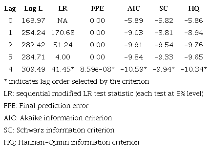 Where y is the natural logarithm of the real gross domestic product, i indicates the number of lags required, and are iid processes.