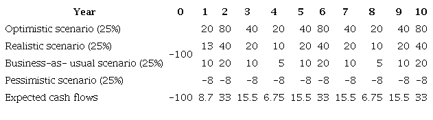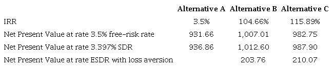In this case, the IRR favors alternative C, but the present values (PV) with the risk-free rate and with the SDR indicate that alternative B (the first venture) is the best one. However, if we consider the risk premium instead of the NSR and the representative entrepreneur’s loss aversion, thenthe best option is alternative C (the second venture), which has less scenarios with losses.