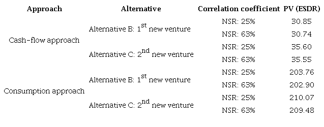 Table 6 has a comparison of the PV associated with each investment alternative by considering three situations: the risk-free rate, the SDR, and the ESDR.